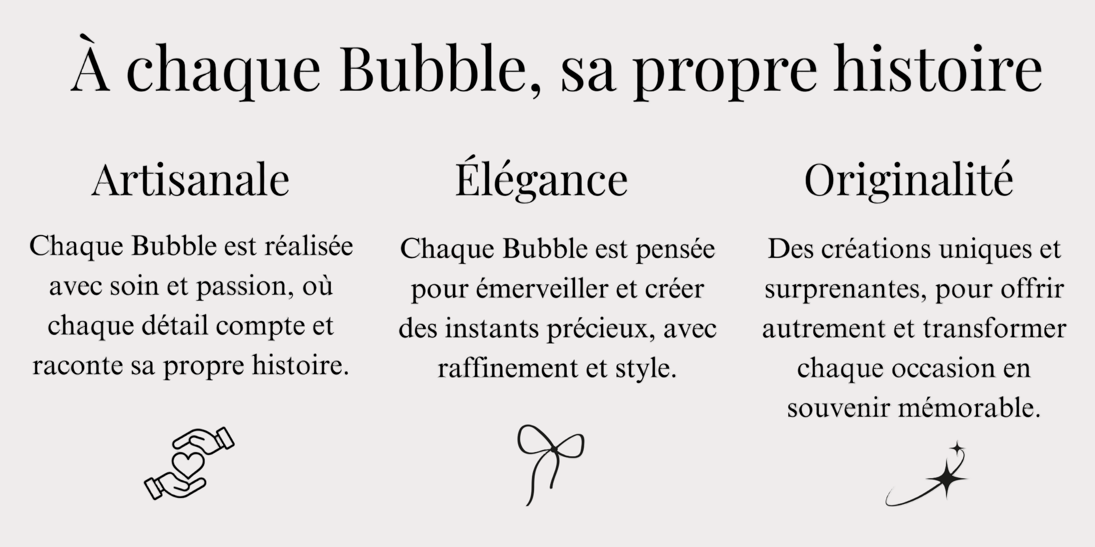 Des ballons bulles transparents renfermant des cadeaux uniques et raffinés. Offrir autrement, avec élégance et émotion. Chaque occasion mérite sa bulle de rêve.