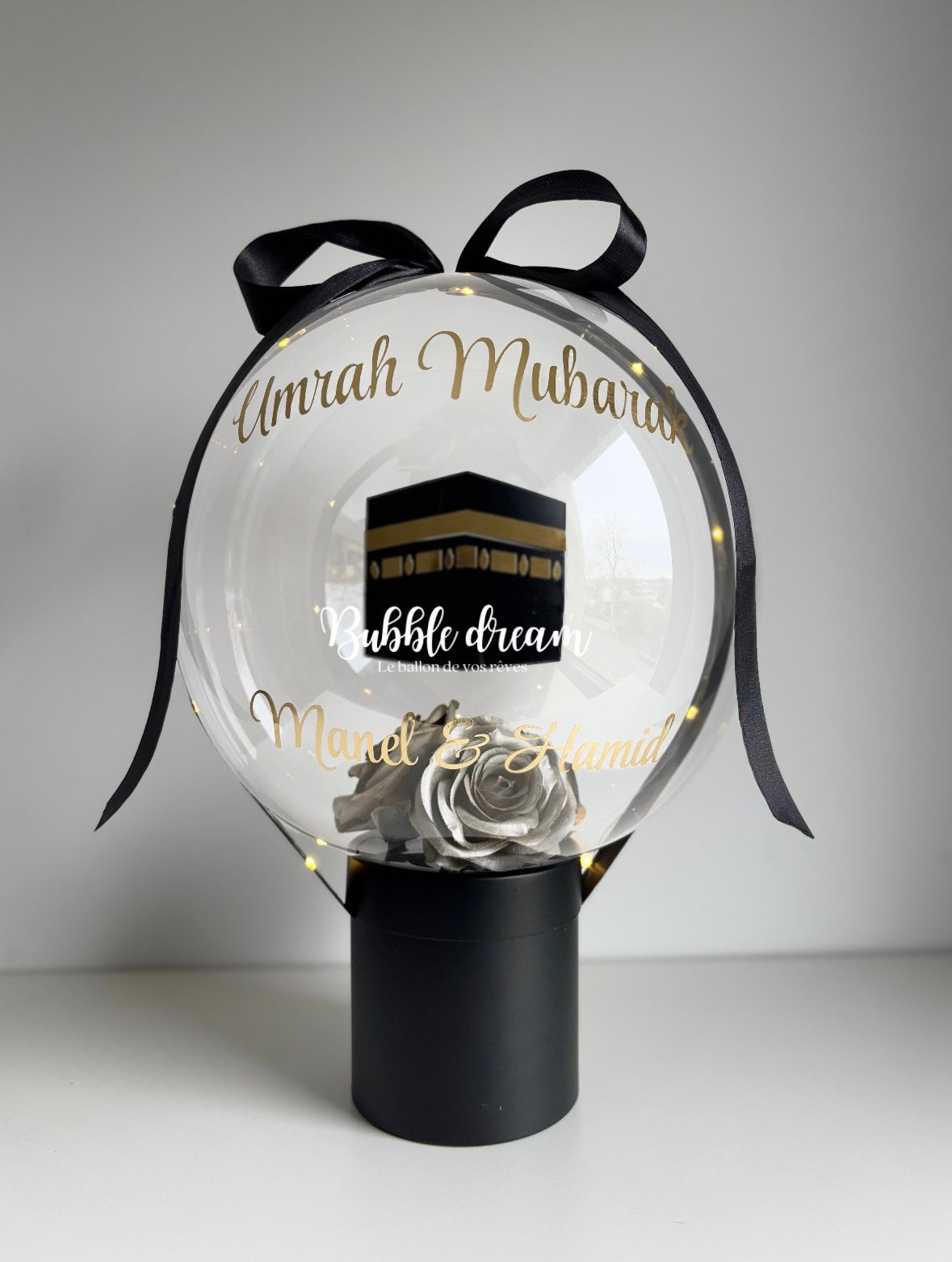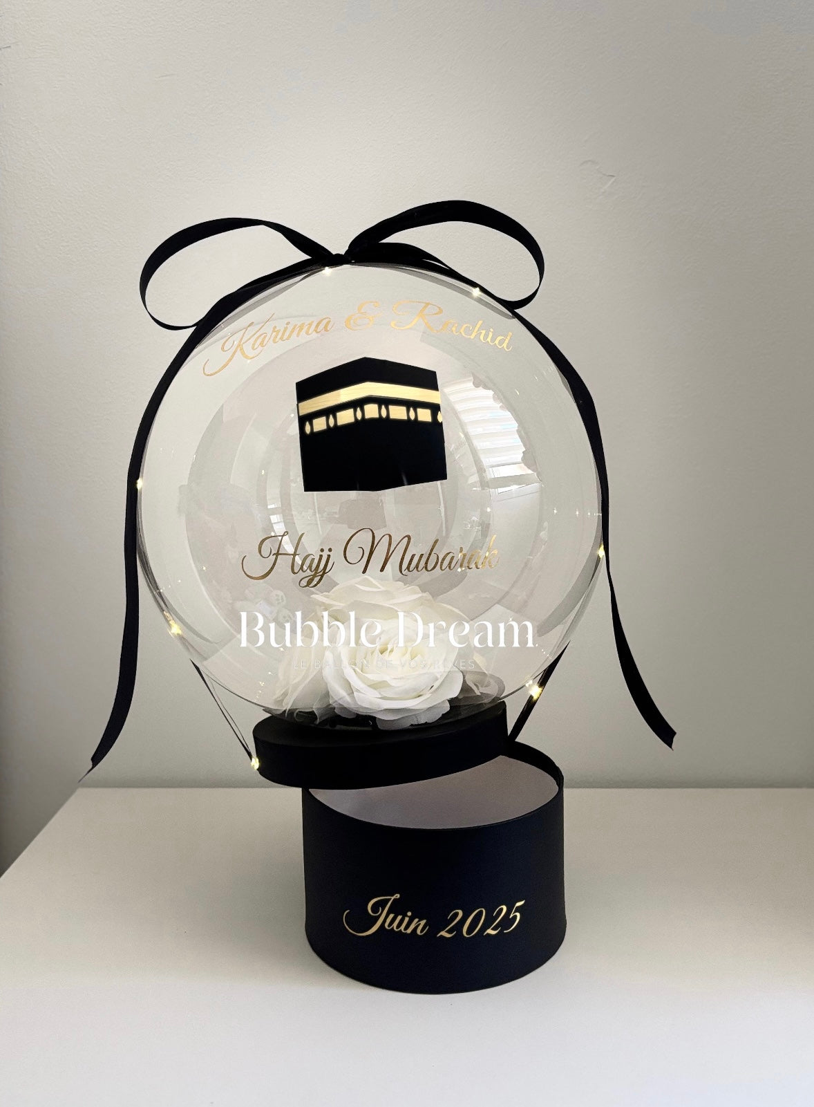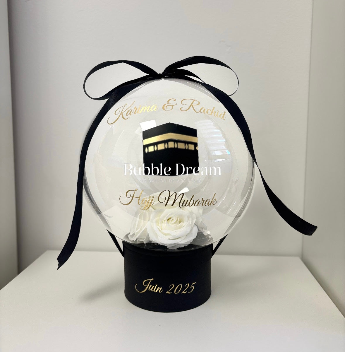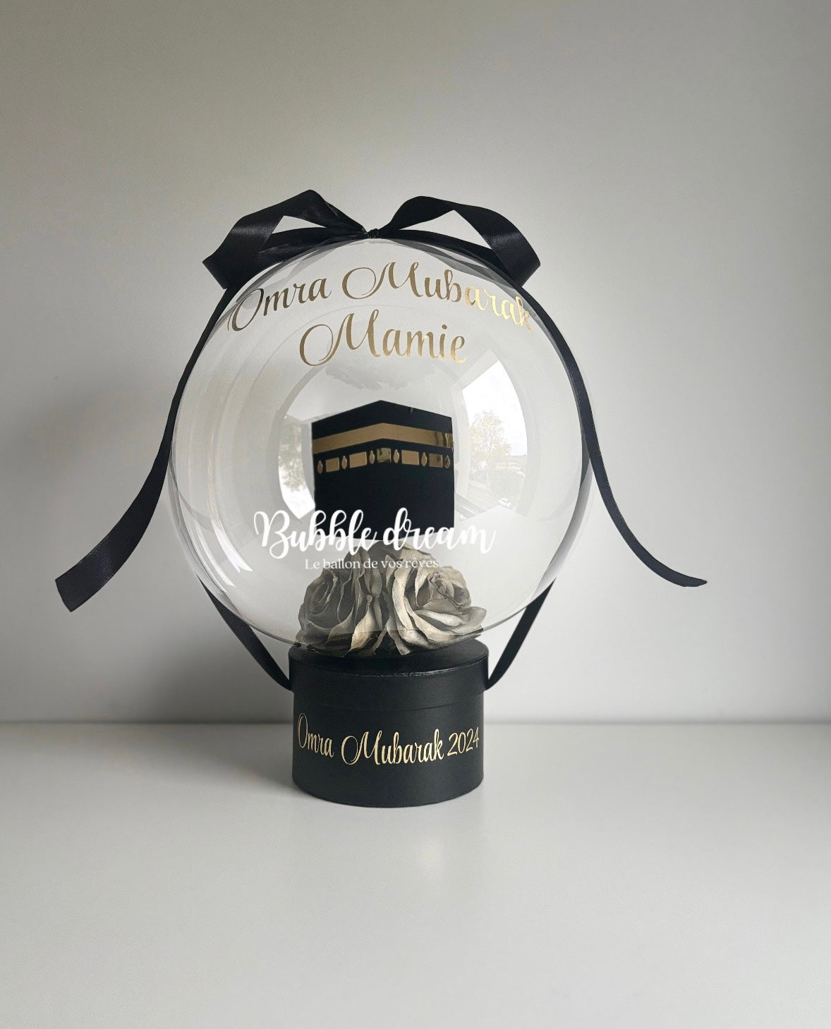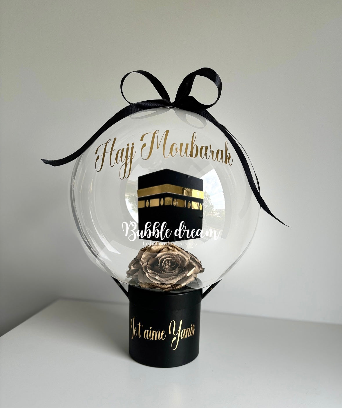 Une élégante Bubble composée de roses dorées ou d'une composition florale de la couleur de votre choix, d'une boîte noire et d'un ruban noir.